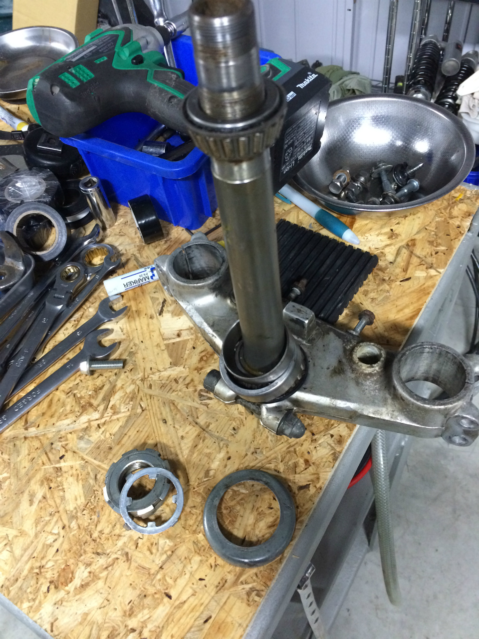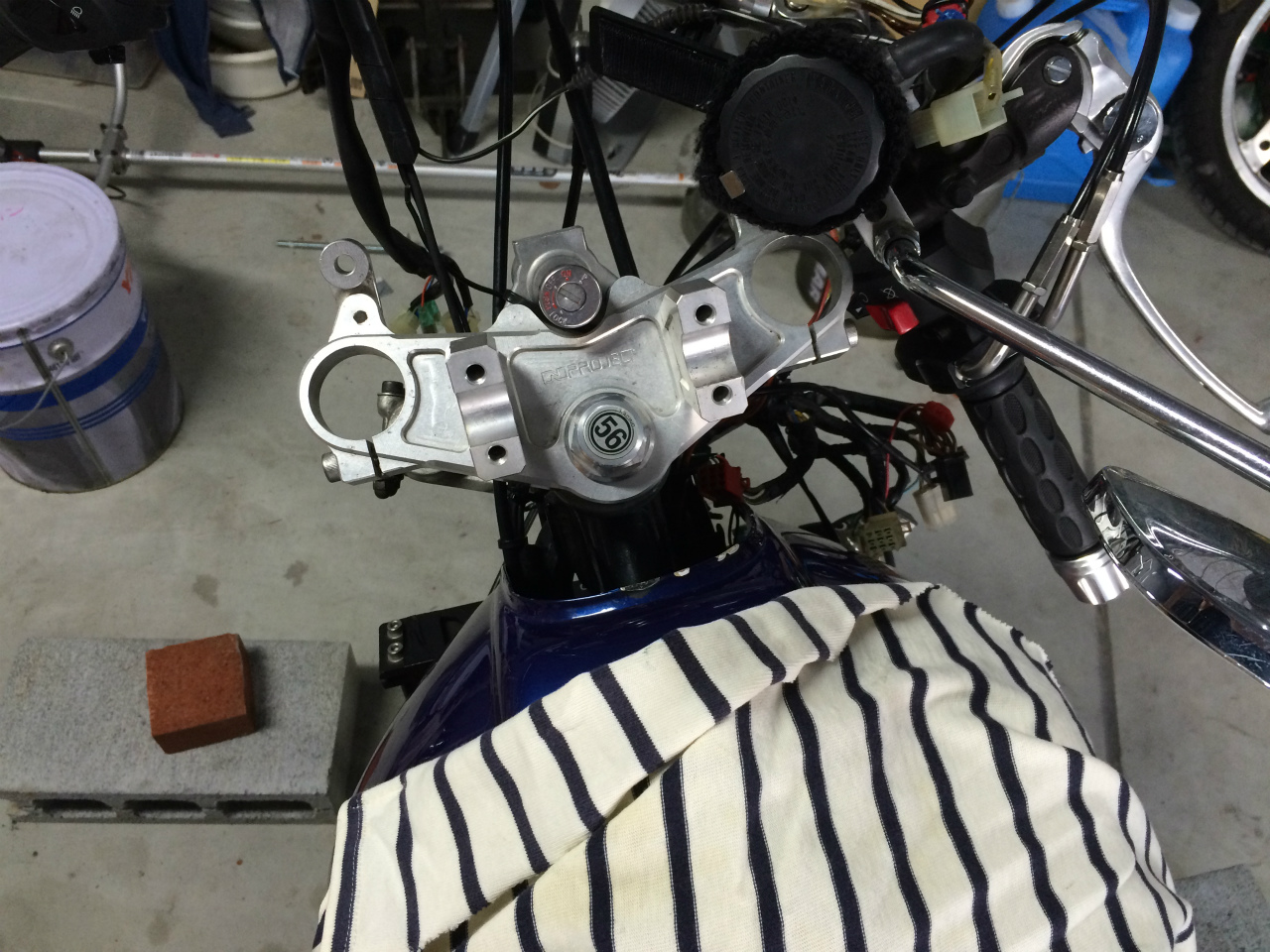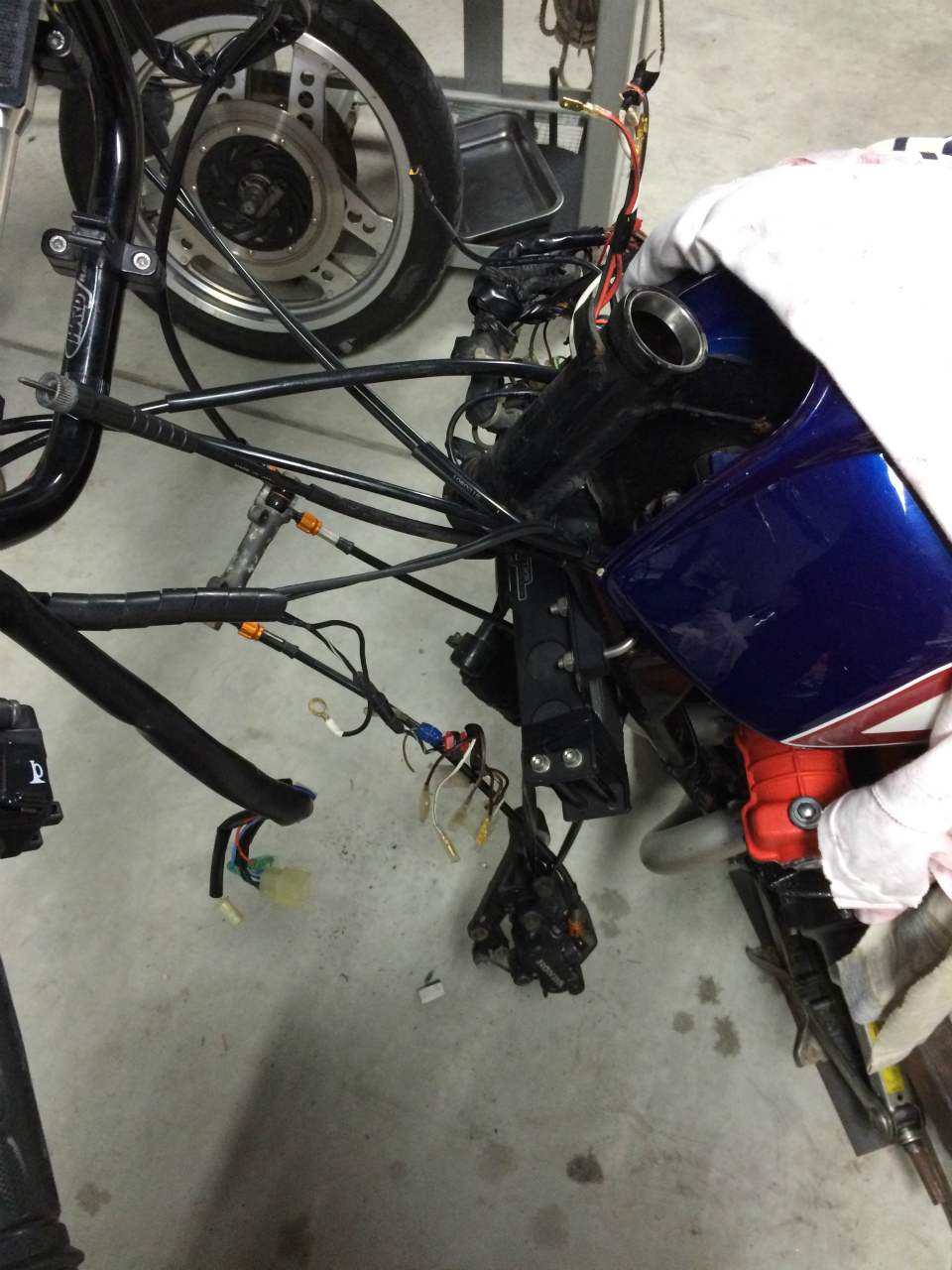 ウィンカー外し→ホーン外し→ブレーキキャリパ辺り外し→フェンダ外し→ホイール外し→ステムフォーク固定ボルト→フォーク取り外し→トップステム緩め→三叉取り外し→レレース外しまで。