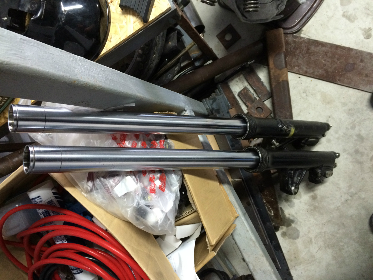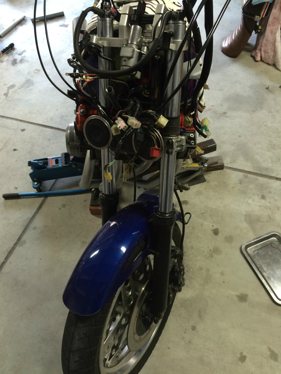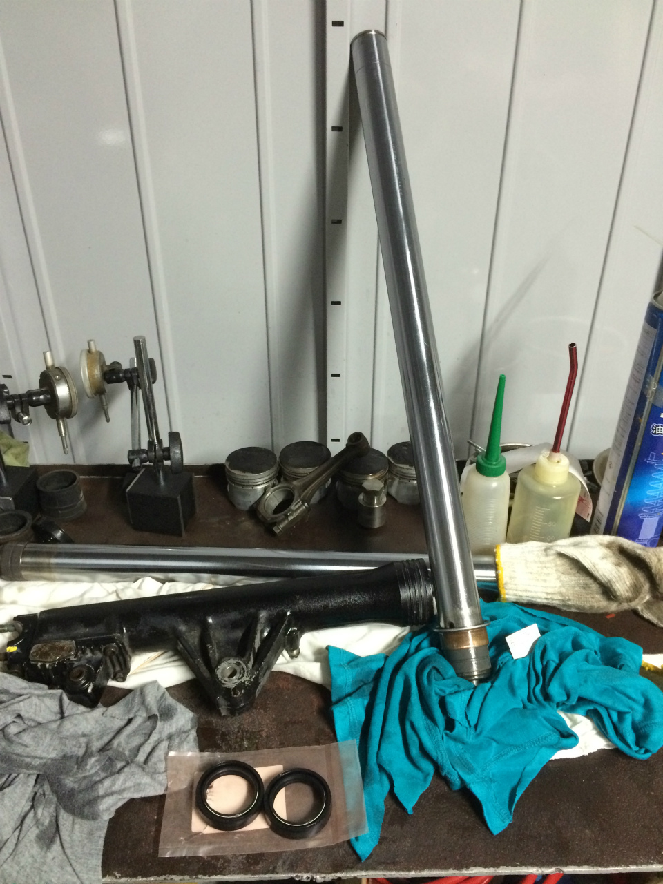 ウィンカー外し→ホーン外し→ブレーキキャリパ辺り外し→フェンダ外し→ホイール外し→ステムフォーク固定ボルト→フォーク取り外し→トップステム緩め→三叉取り外し→レレース外しまで。