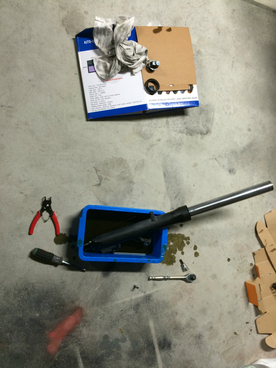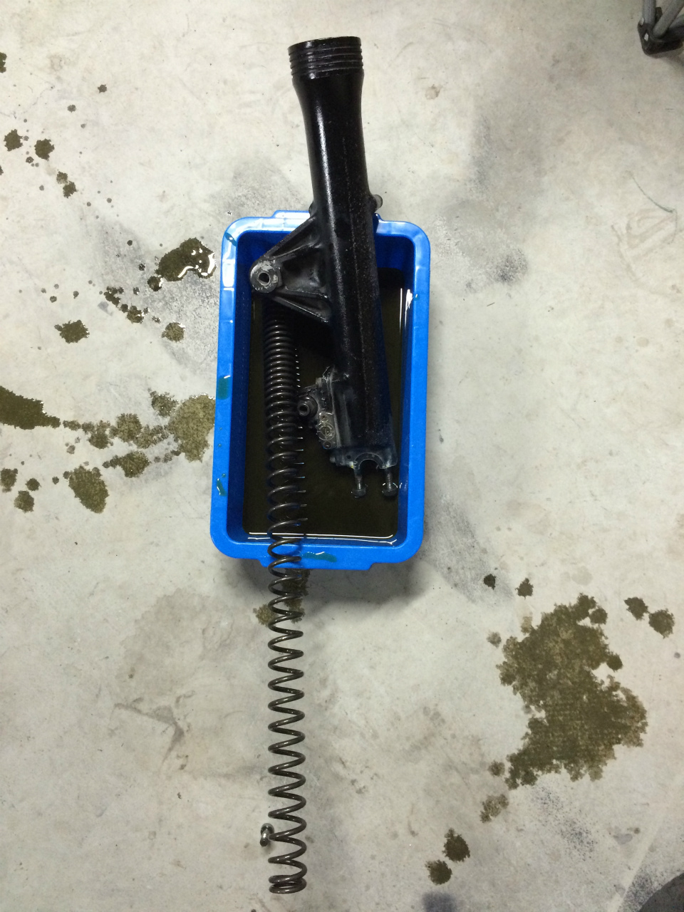 分解と掃除は昨日のうちに済ませておいたので、塩ビ管でオイルシール打ち込んでクリップ入れてオイル入れてじゅぼじゅぼしてあげます。