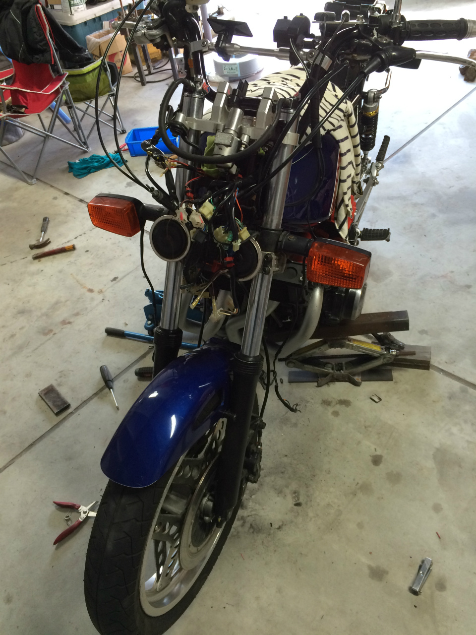 メーター外してライト取って配線出してハンドルポスト外して天井からハンドルひっくり返らない様に吊って準備オッケー!