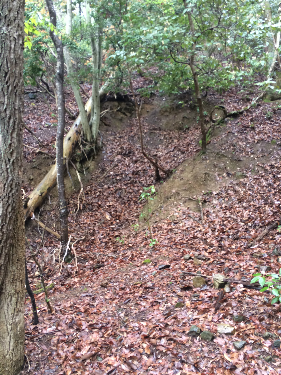 何とか下段の坑口まで到着・・・かと思ったが突然坂道の途中に試掘の跡が。