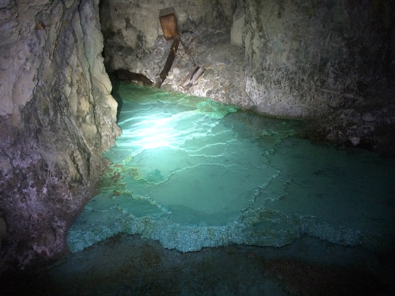 ここに来るまでは画像2枚目の様に緑色の鉱水が流れ続けています。