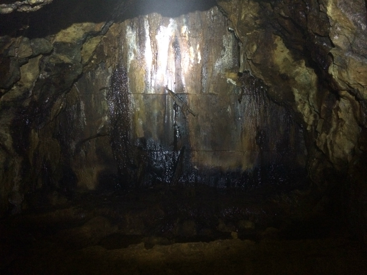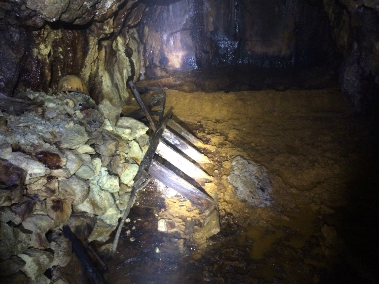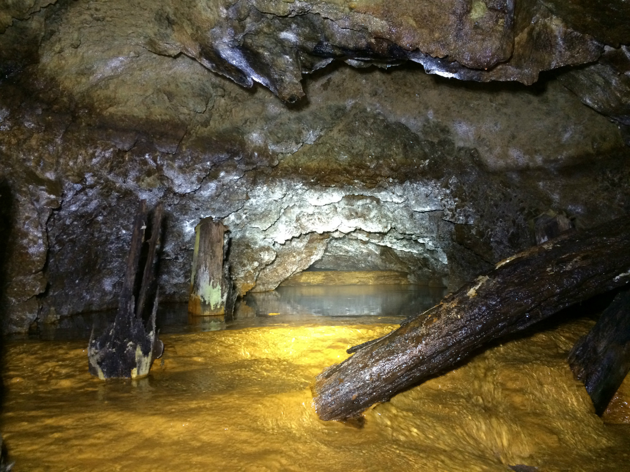 坑道の天井まで完全に水没した水垢の跡がありますね。