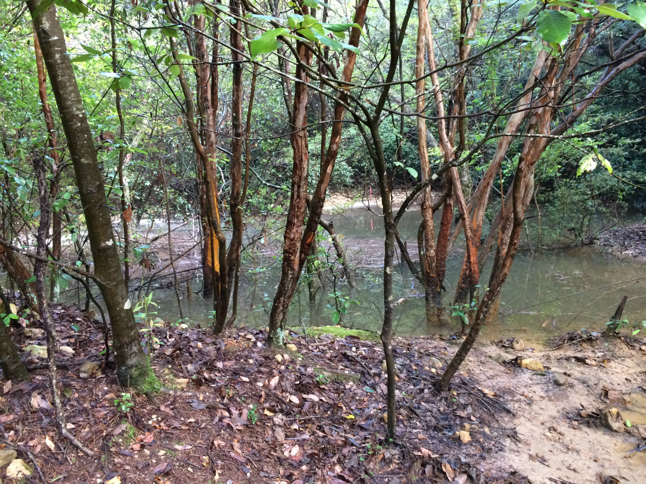 土留めから溢れている水を辿っていくとすぐに池がありその先には大崩落した場所が。
