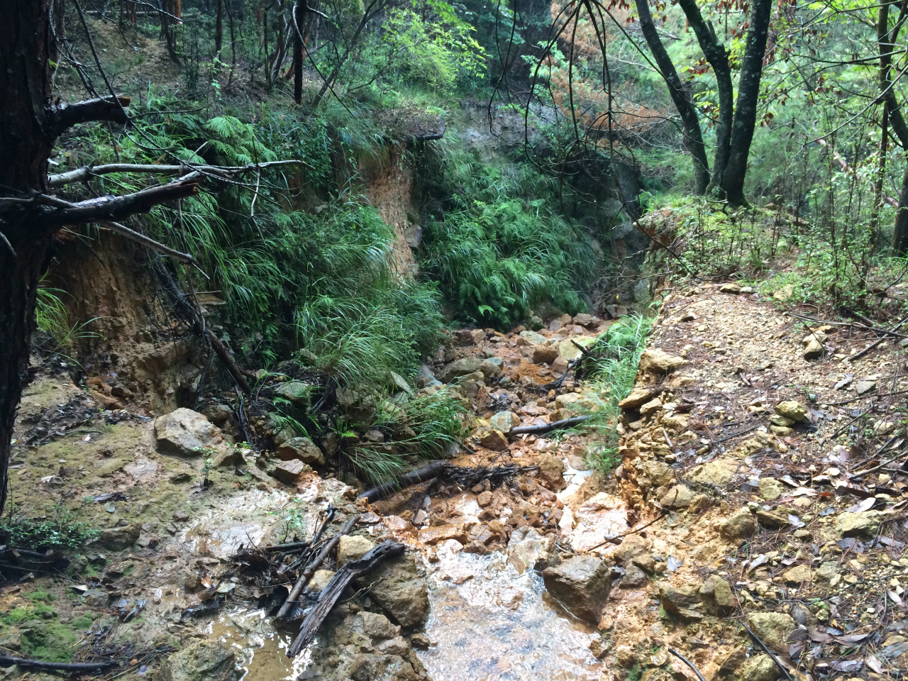 幾多の雨で道も大きくえぐられており一部オーバーハングも・・