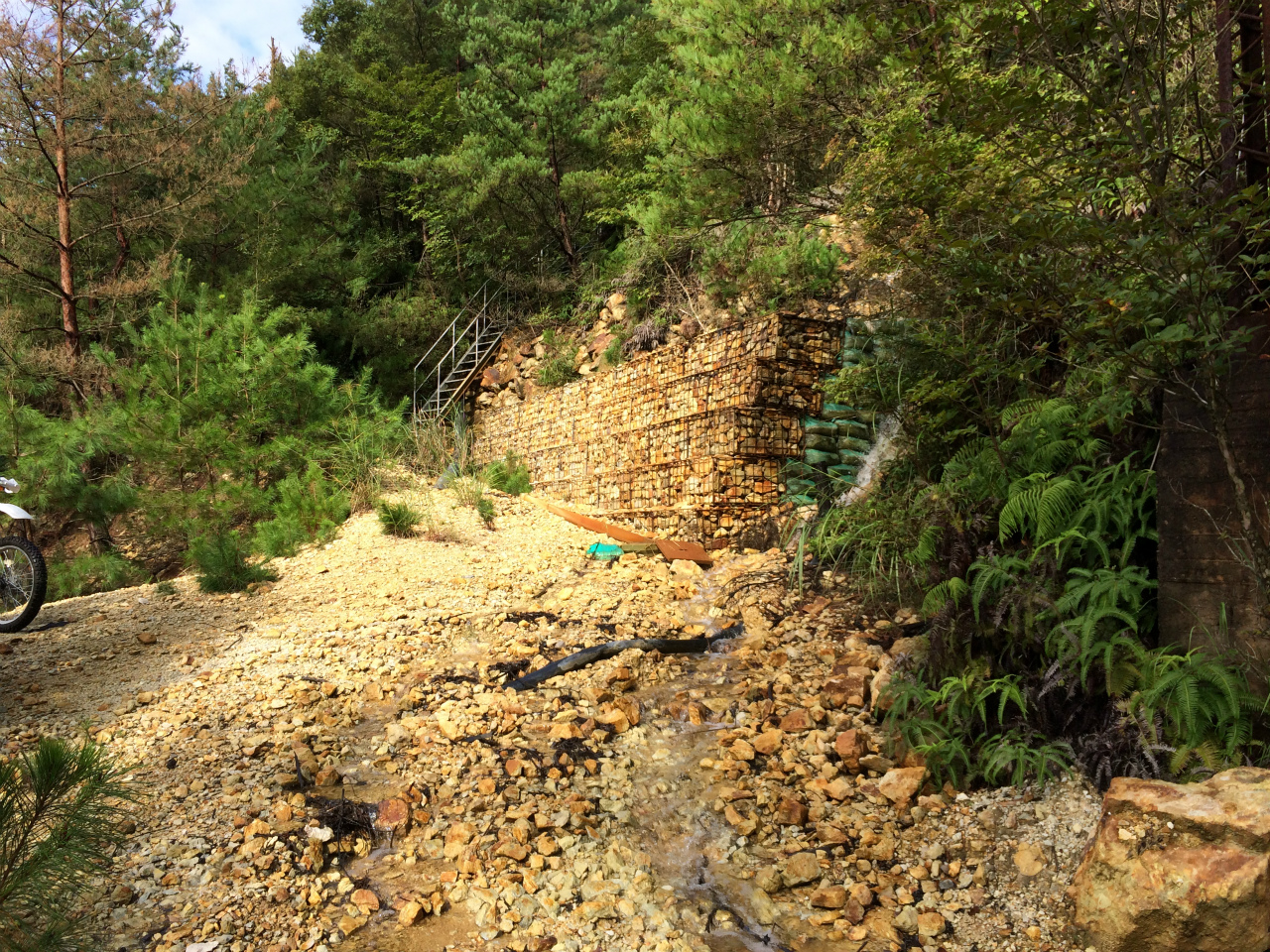 ここから前回の北側の道を降りて行き中腹の坑口まで行くのですが北側は道が荒れておりバイクは押していかないと降りられない勢い・・