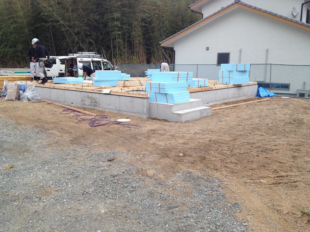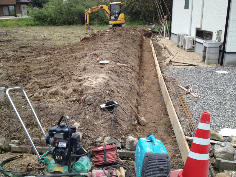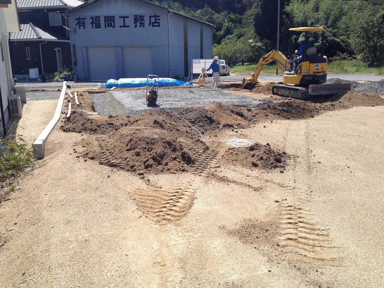 前回の記事の少し後に行くと基礎の転圧やってました。