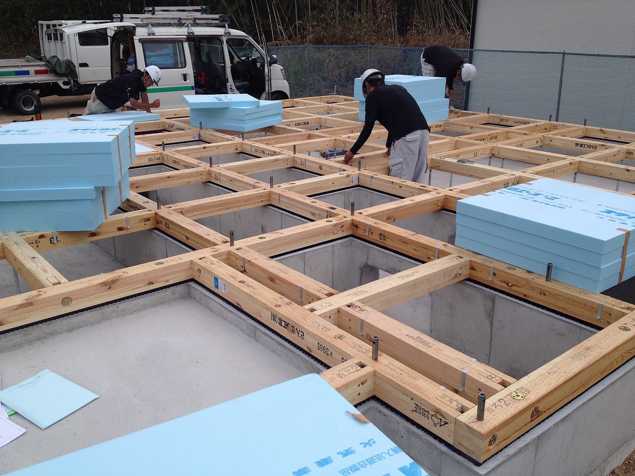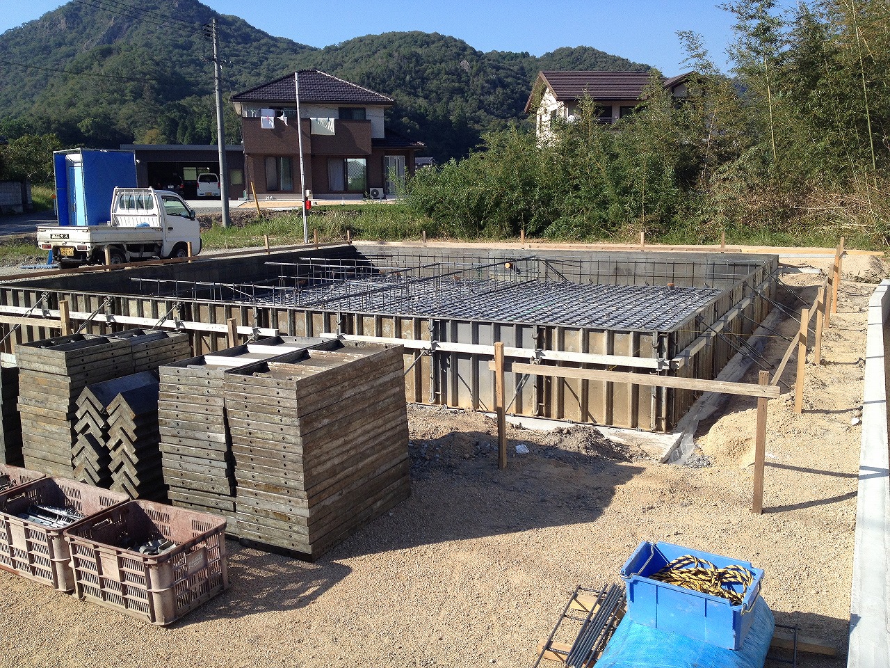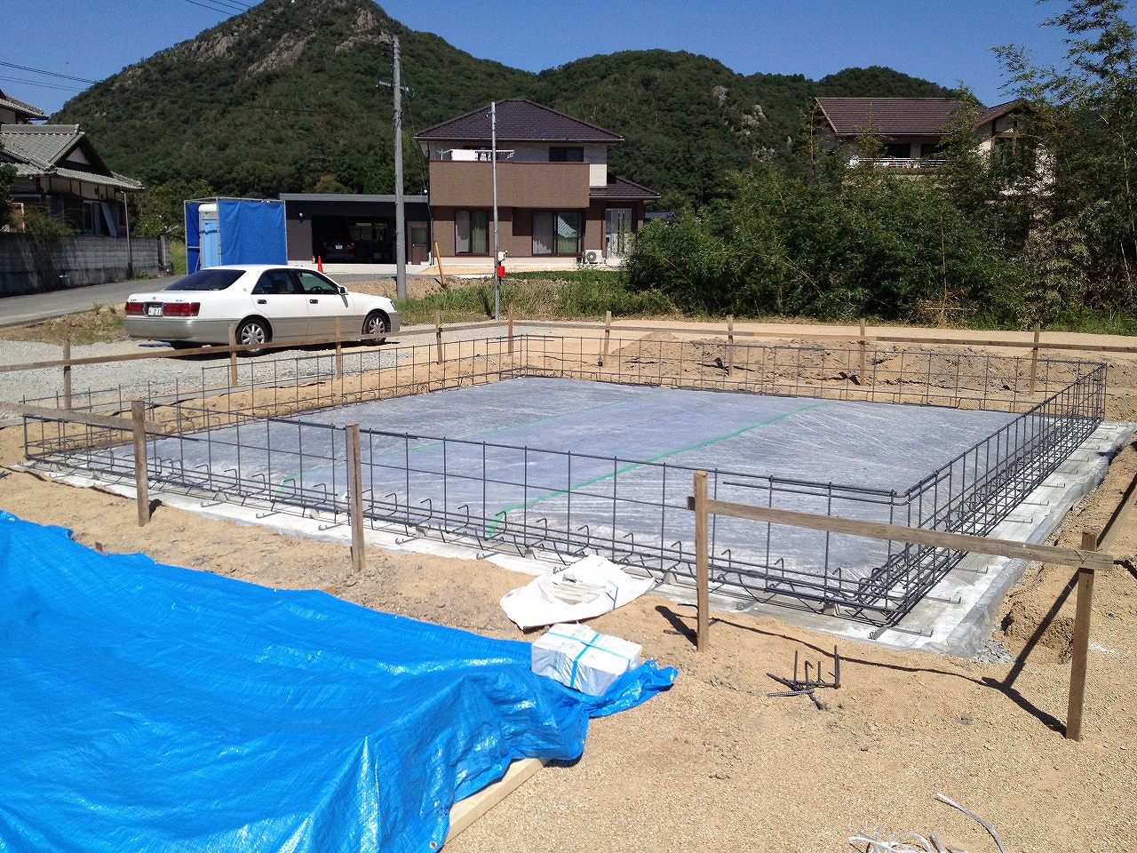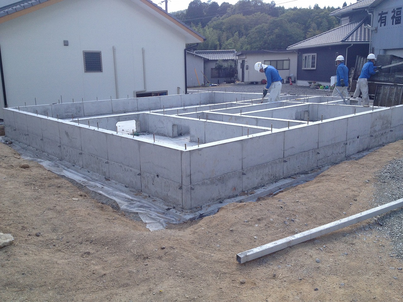 画像はないですが基礎配筋補強してから型枠据えて立ち上がりに流し込んでたみたいです。
