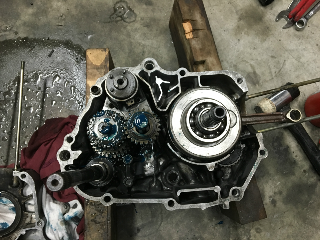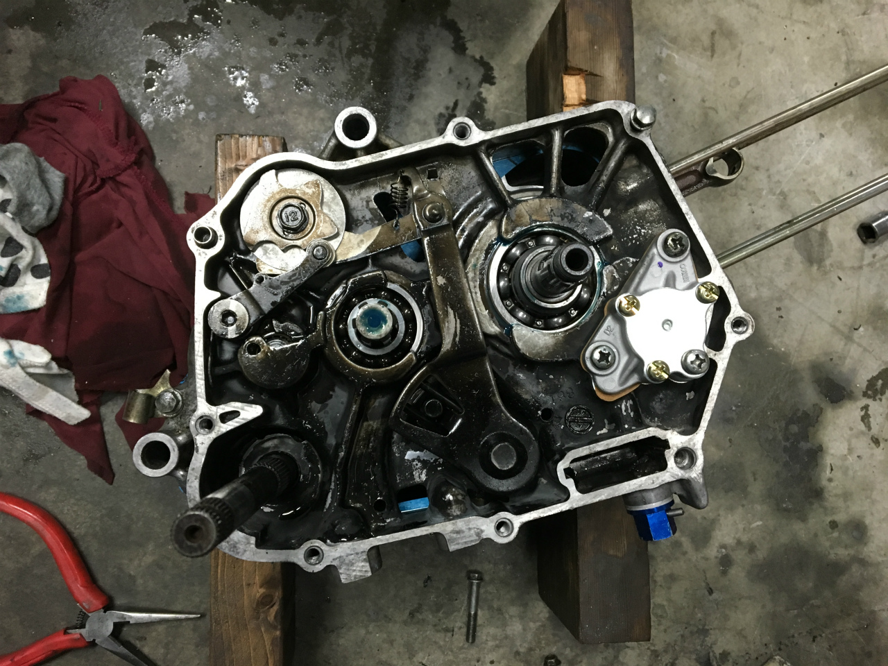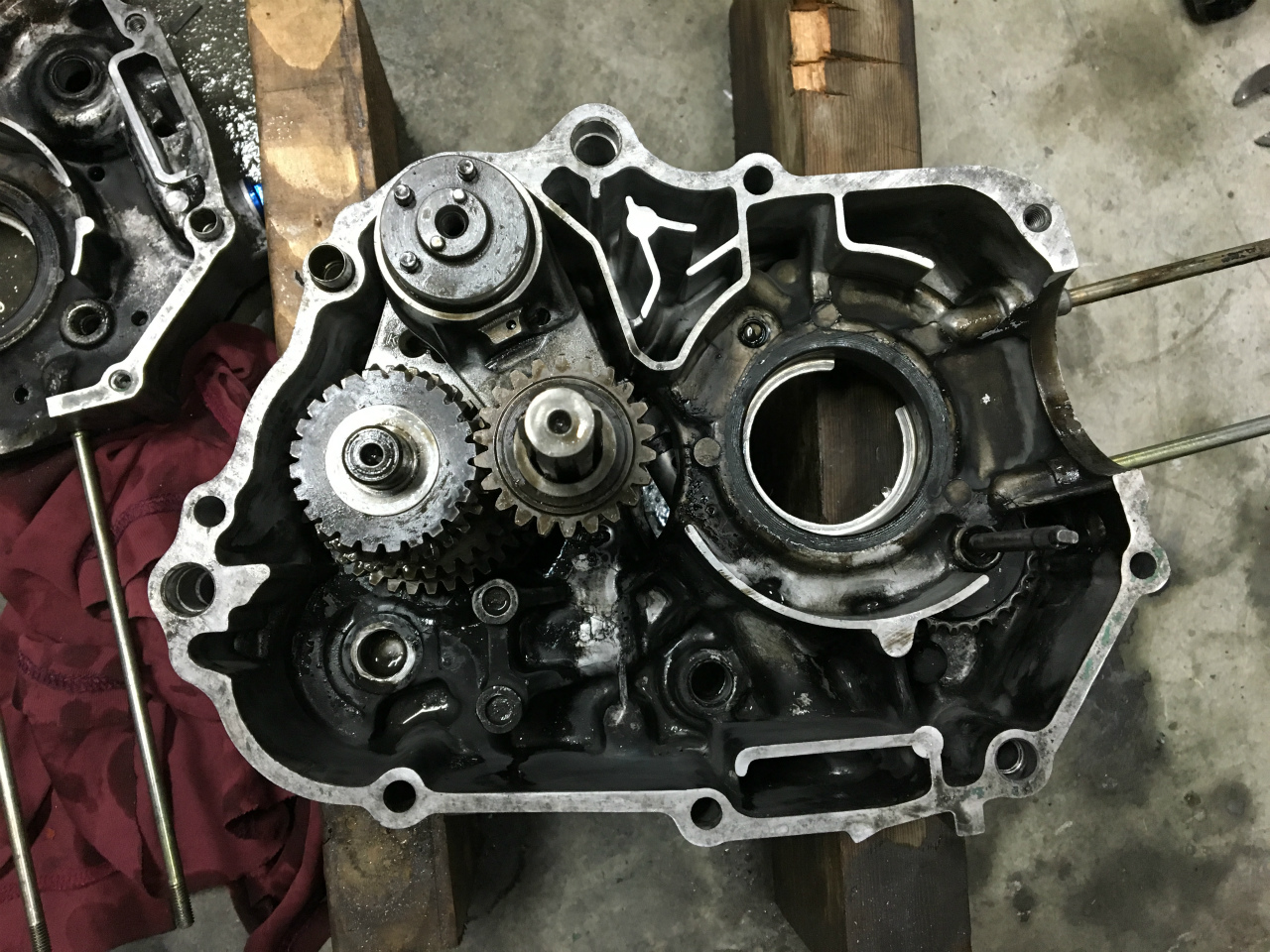 ペースト塗って、ミッション組んで、キックスタタ組んでワッシャー入れて、クランク入れてケース合わせて、合わせのボルト締めて、振れたクランクのスラスト見たフリだけして、新品オイルポンプ付けて、シフト周り組ました。