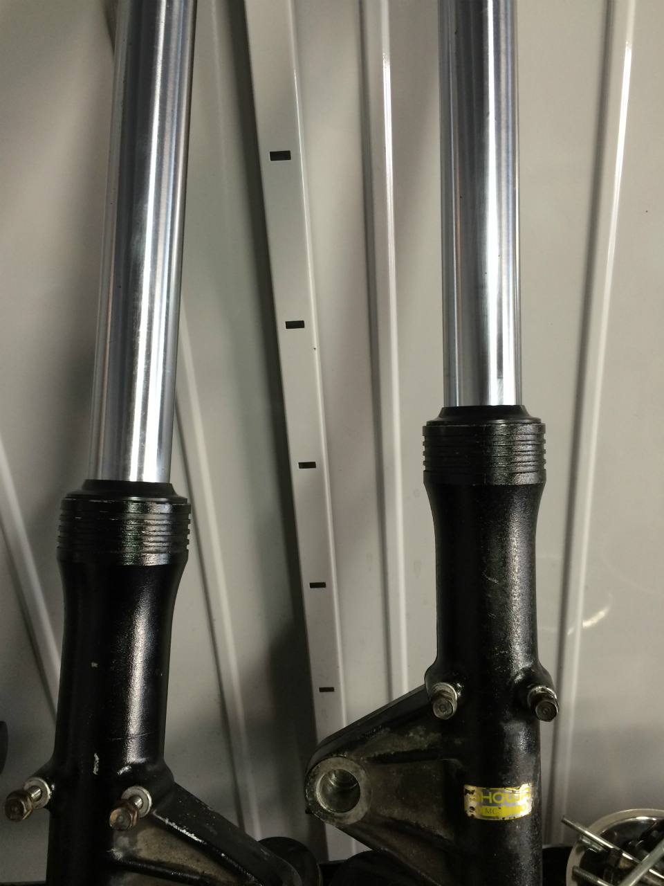 ウィンカー外し→ホーン外し→ブレーキキャリパ辺り外し→フェンダ外し→ホイール外し→ステムフォーク固定ボルト→フォーク取り外し→トップステム緩め→三叉取り外し→レレース外しまで。