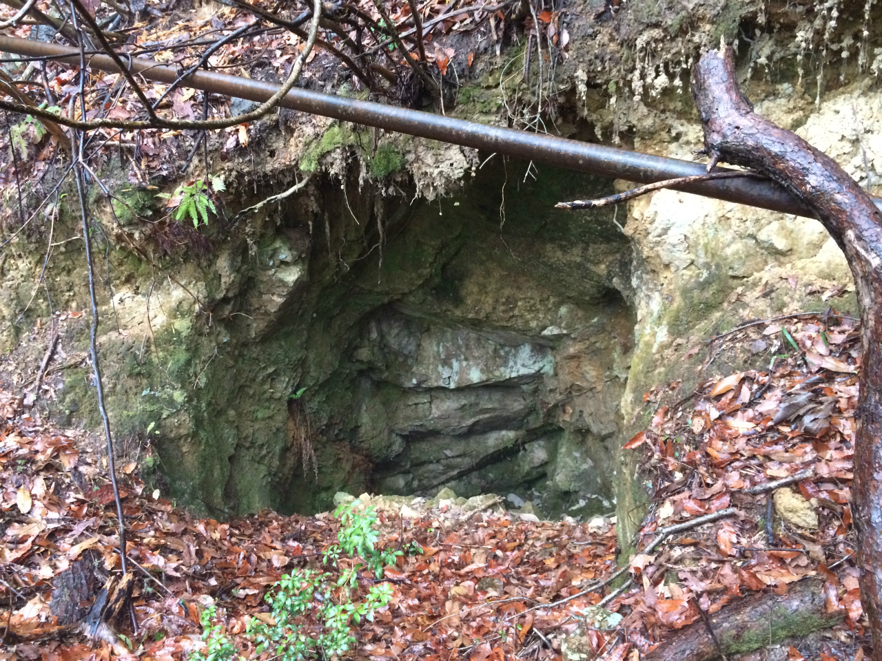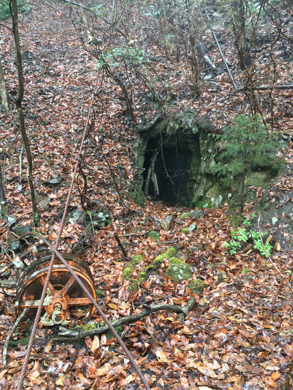 精錬所の近くに坑口がありました内部覗くと少しだけ水平と下側に少し掘ってありましたが脈が細かったみたい。