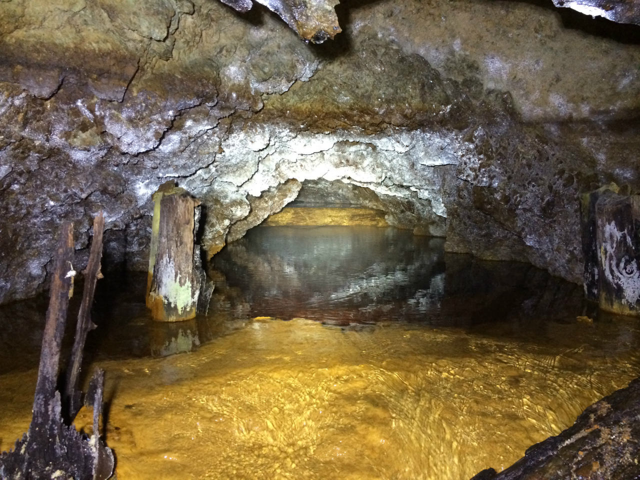 坑道の天井まで完全に水没した水垢の跡がありますね。