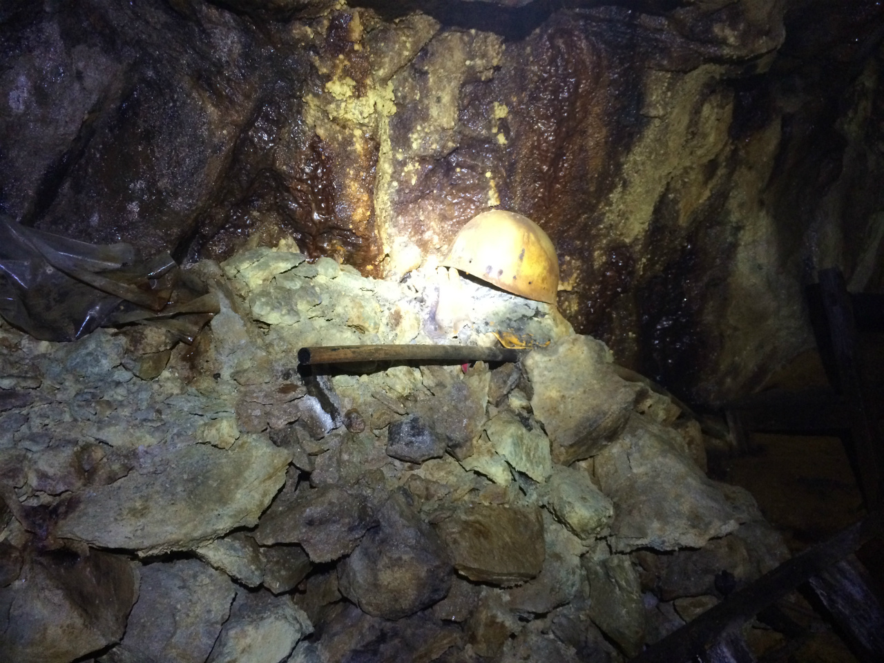 下流にまで鉱石が落ちているみたいだけどこの露頭の下が中腹辺りになり坑口もあることを考えると露頭の真下辺りをを掘っているのだろうか。